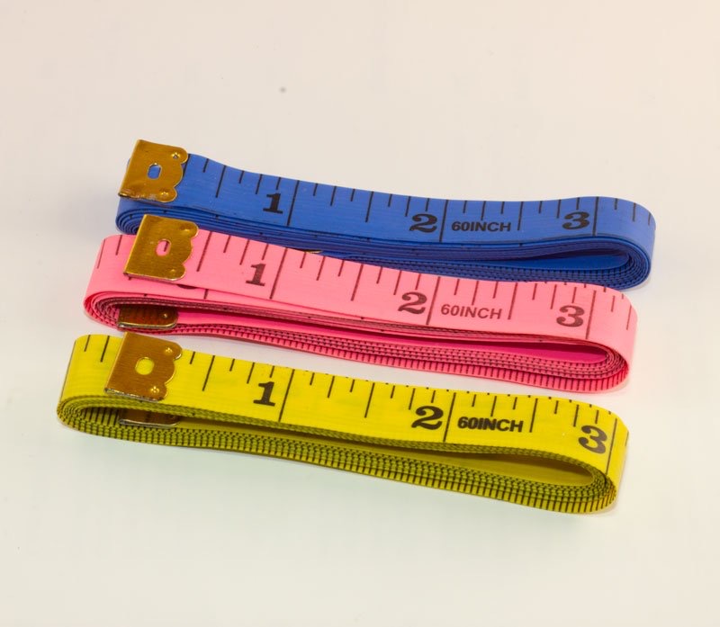 Cinta métrica plástica, en centímetros y pulgadas, hasta 150cm y 60 pulgadas.